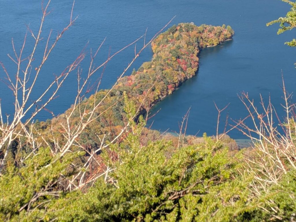 赤はいい感じですが、例年よりモザイクが弱い2025年の八丁出島の紅葉です