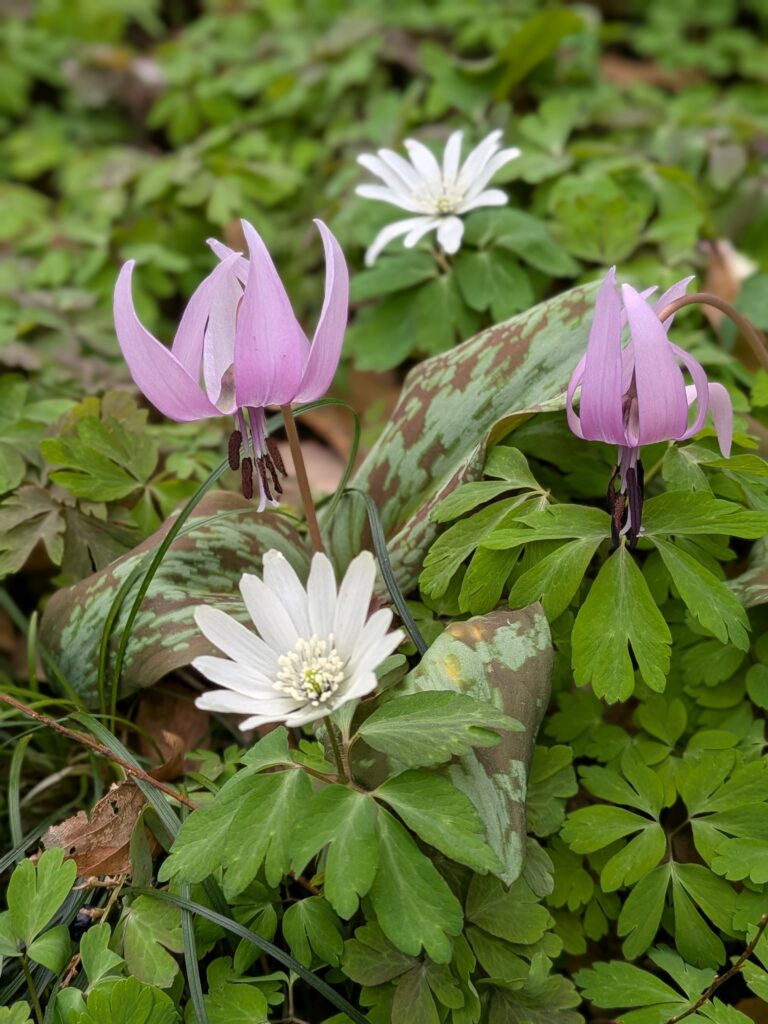 見頃のアズマイチゲの中にカタクリが咲いてる様子もいいですよ。