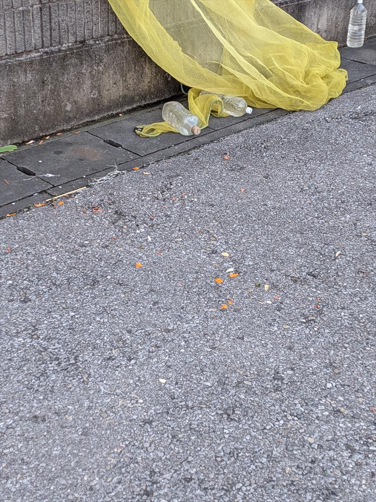 このように、ペットボトルを置いてもみかんの皮が散財するゴミ置き場があります